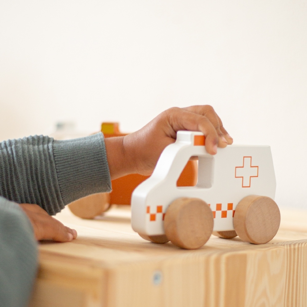 ●可從窗邊的小洞,帶著木質救護車前往救援,訓練手部小肌肉