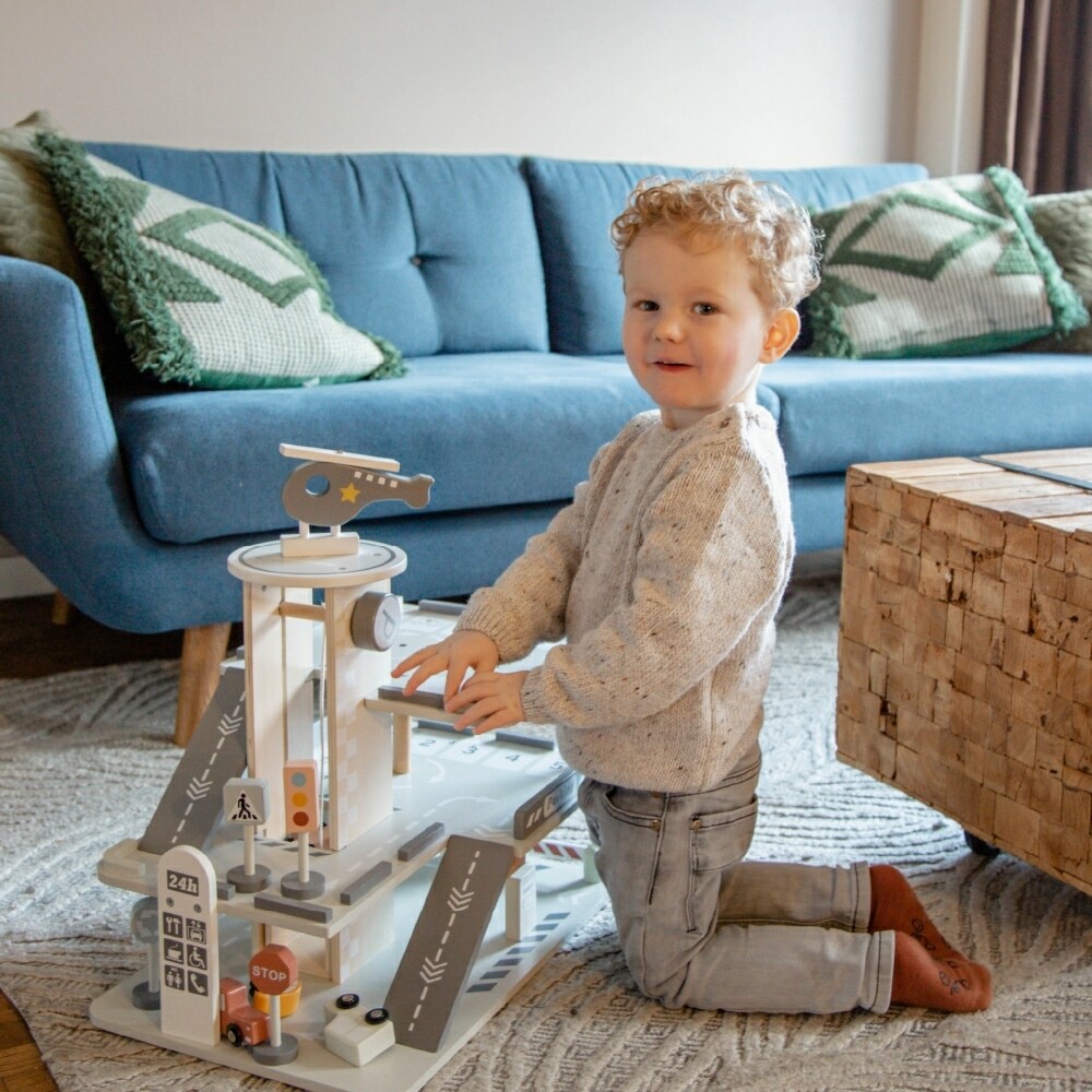 ●三層樓的停車場和多個停車位,包含直行道、彎曲道路、起重機等設計,讓孩子可以模擬停車場場景,提升空間感和邏輯思考