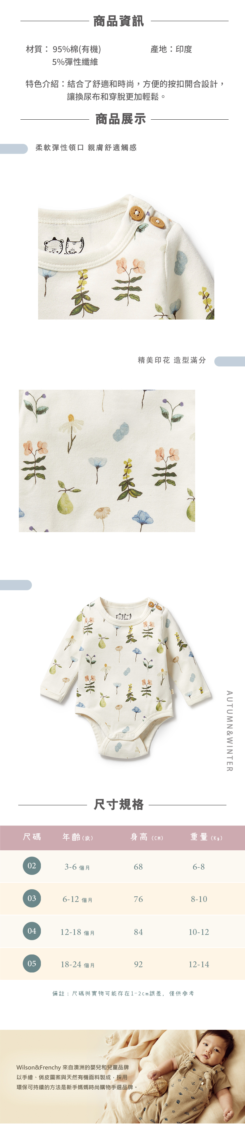 Wilson & Frenchy 嬰兒手繪草花長長袖包屁衣 W43-D01-08-BG-WF