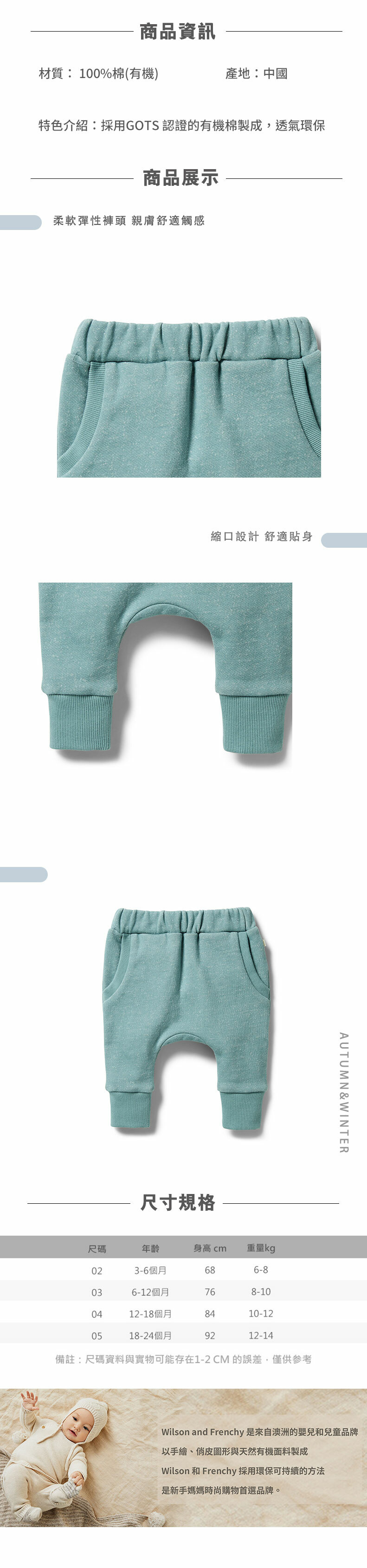 Wilson & Frenchy 嬰兒湖水綠休閒長褲 W23-F01-02-BB-BB